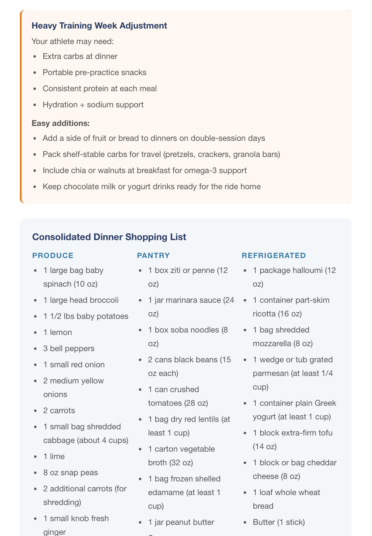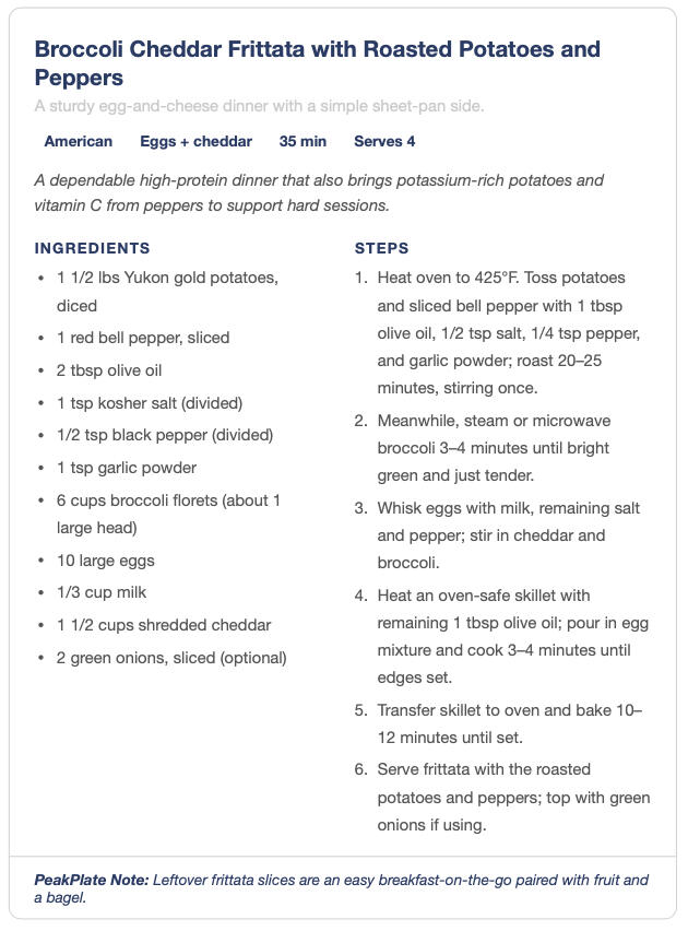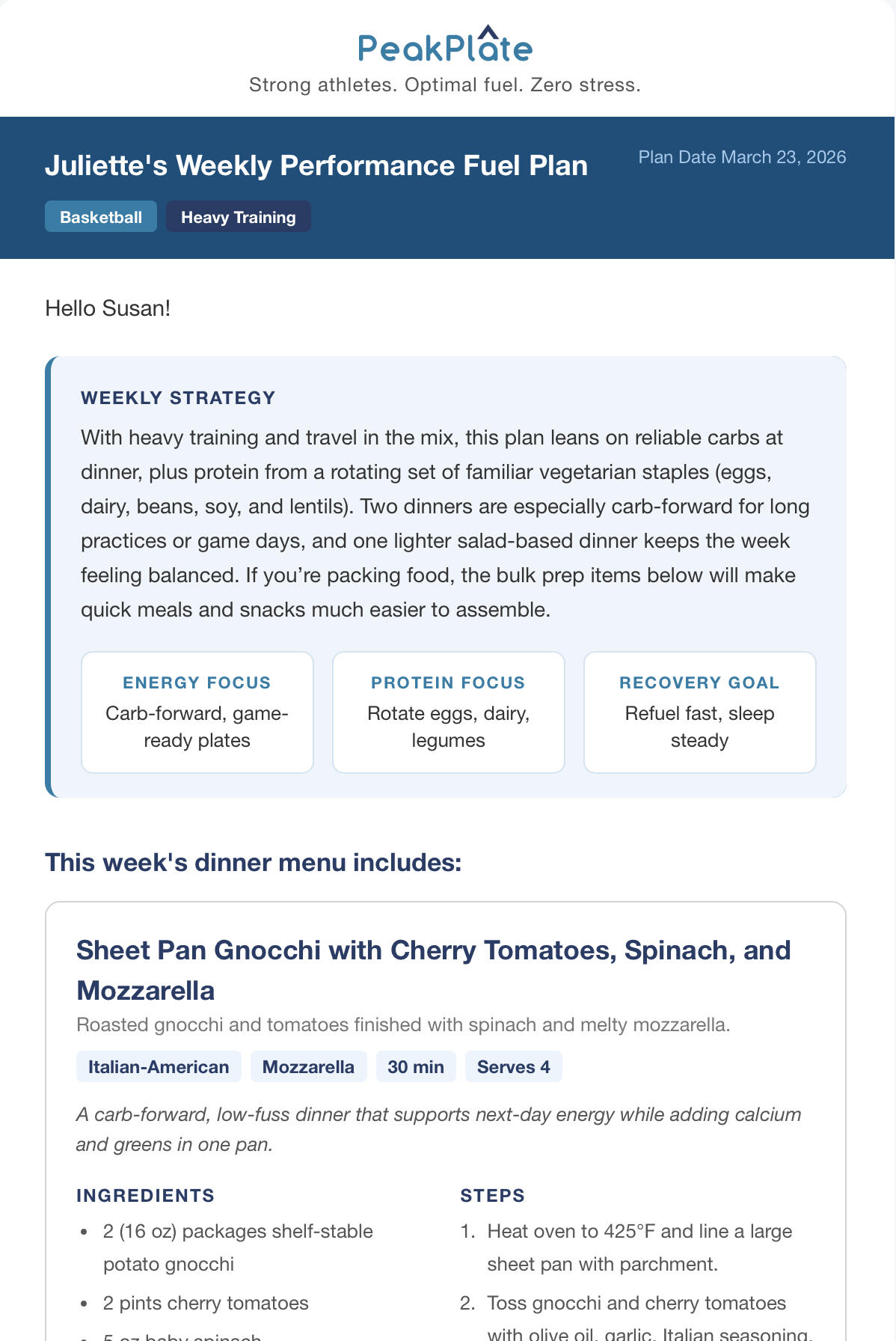 Each week, you'll receive a clear, easy-to-follow nutrition plan tailored to your athlete’s sport, training intensity, and dietary needs .Meals are designed for real families - simple enough for weeknights, yet structured to support athletic performance and recovery.